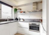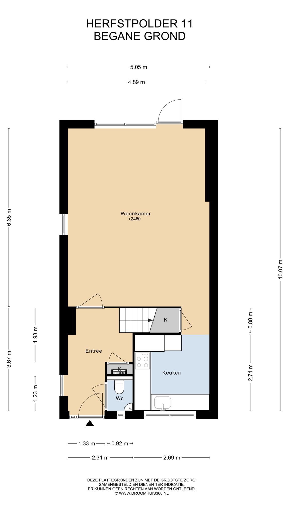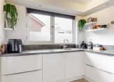 de ruime entree/hal, met modern (hangend) toilet en meterkast, geeft toegang tot de uitgebouwde tuingerichte woonkamer met extra zijraam. De half open keuken met praktische trapkast bevindt zich aan de voorzijde. De moderne keukeninrichting is in 2020 geplaatst, heeft een U-opstelling en is voorzien van afzuigkap, magnetron/oven, inductie kookplaat, vaatwasser, koelkast en vriezer. De gehele begane is afgewerkt met een moderne PVC vloer.