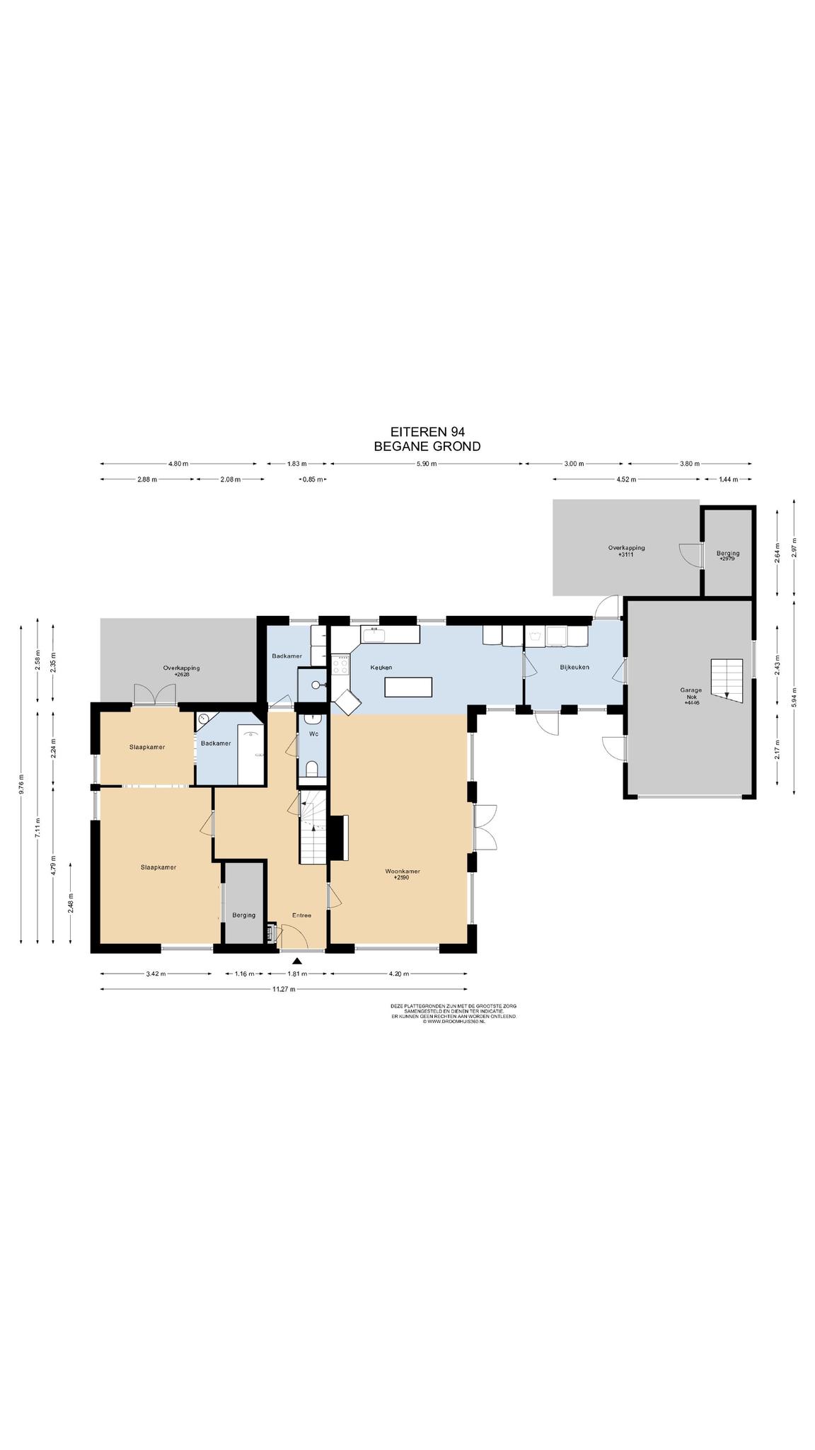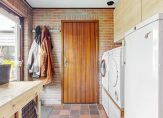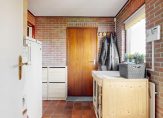 een centraal gesitueerde hal/entree met meterkast en kelder(tje), toilet en badkamer. Deze badkamer is in 2023 vernieuwd en voorzien van wastafelmeubel en inloopdouche. Aan de rechterzijde van de hal bevinden zich de woonkamer met aansluitend de ruime keuken. De openslaande deuren in de woonkamer geven toegang tot de tuin en terras. Vanuit de keuken is de praktische bijkeuken bereikbaar welke weer toegang geeft tot de garage. Hier bevindt zich een trap naar een bergzolder.