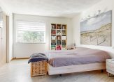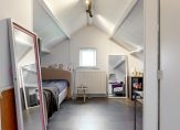 Een deur aan de linkerzijde in de hal geeft toegang tot een grote slaapkamer met inpandige bergruimte en met eigen badkamer en suite. De slaapkamer kan eventueel omgebouwd worden naar een tweede slaapkamer. De dubbele openslaande deuren geven toegang tot achtergelegen terras met overkapping.