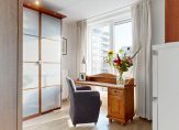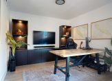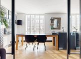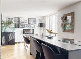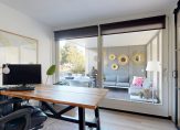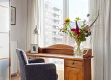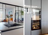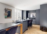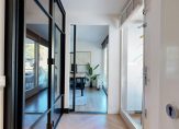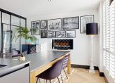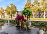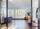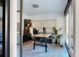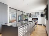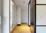 Eerste verdieping: aan de achterzijde ligt de ruime woonkamer met grote raampartijen, waardoor de ruimte heerlijk licht is. Een moderne glazen wand met stalen deur scheidt de woonkamer van de eetkeuken. De royale keuken is recent geplaatst en uitgevoerd in een hoekopstelling met kook-/spoeleiland. Voorzien van alle luxe inbouwapparatuur zoals een inductiekookplaat met geïntegreerde afzuiging, oven/magnetron, koelkast, vriezer, vaatwasser, quooker, wijnkoeler en koffieautomaat. De visgraat pvc-vloer met vloerverwarming zorgt voor een stijlvolle en warme uitstraling.