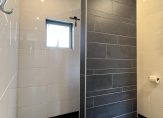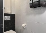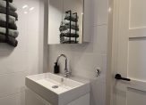 De modern afgewerkte badkamer is voorzien van een wastafelmeubel, vrij hangend toilet en ruime inloopdouche met regendouche en een handdouche.
