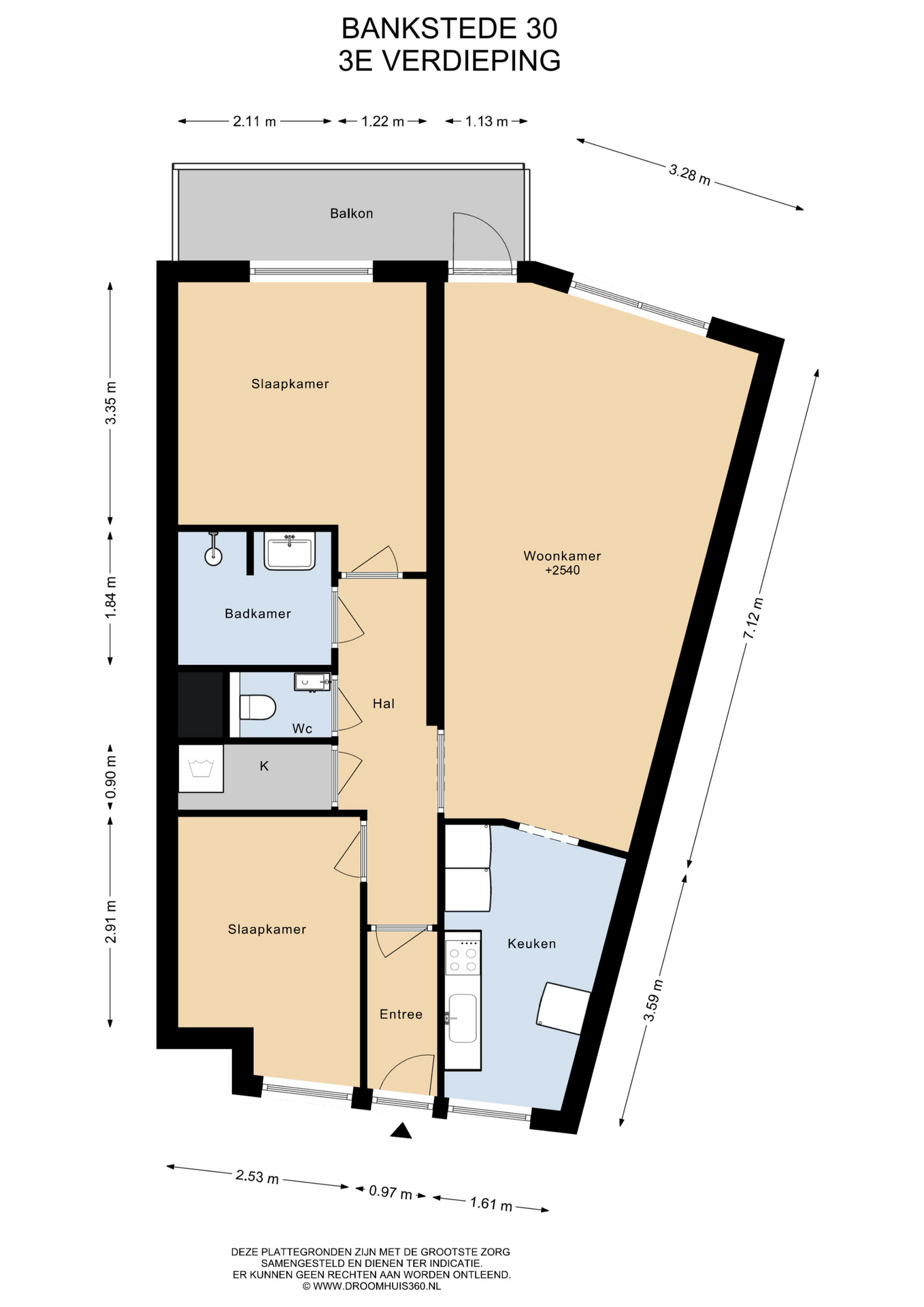 De voordeur geeft toegang tot de ruime hal en zijn een 2-tal ruim bemeten slaapkamers. De badkamer met vaste wastafelmeubel en douchecabine zijn netjes uitgevoerd. Daarnaast treft u in de hal een separate was-/bergruimte en het toilet. Vanuit de hal is de entree naar de woonkamer en geeft een deur toegang tot het ruime en zonnige terras. De dichte keuken bevindt zich aan de voorzijde.