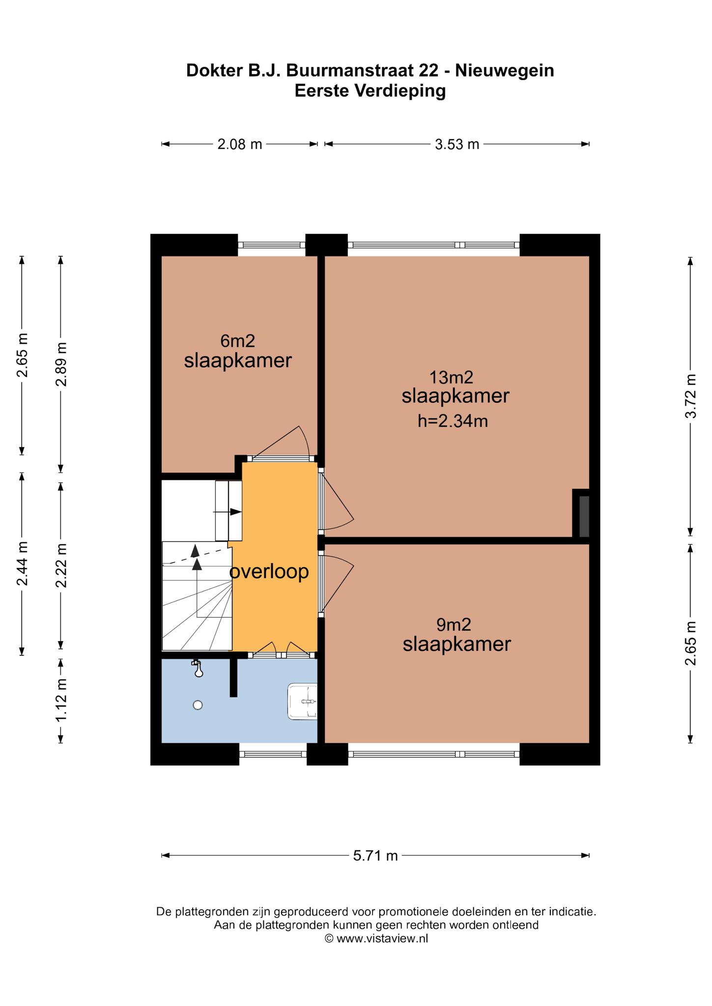 Overloop met toegang naar de drie slaapkamers van respectievelijk 6, 13 en 9 m²