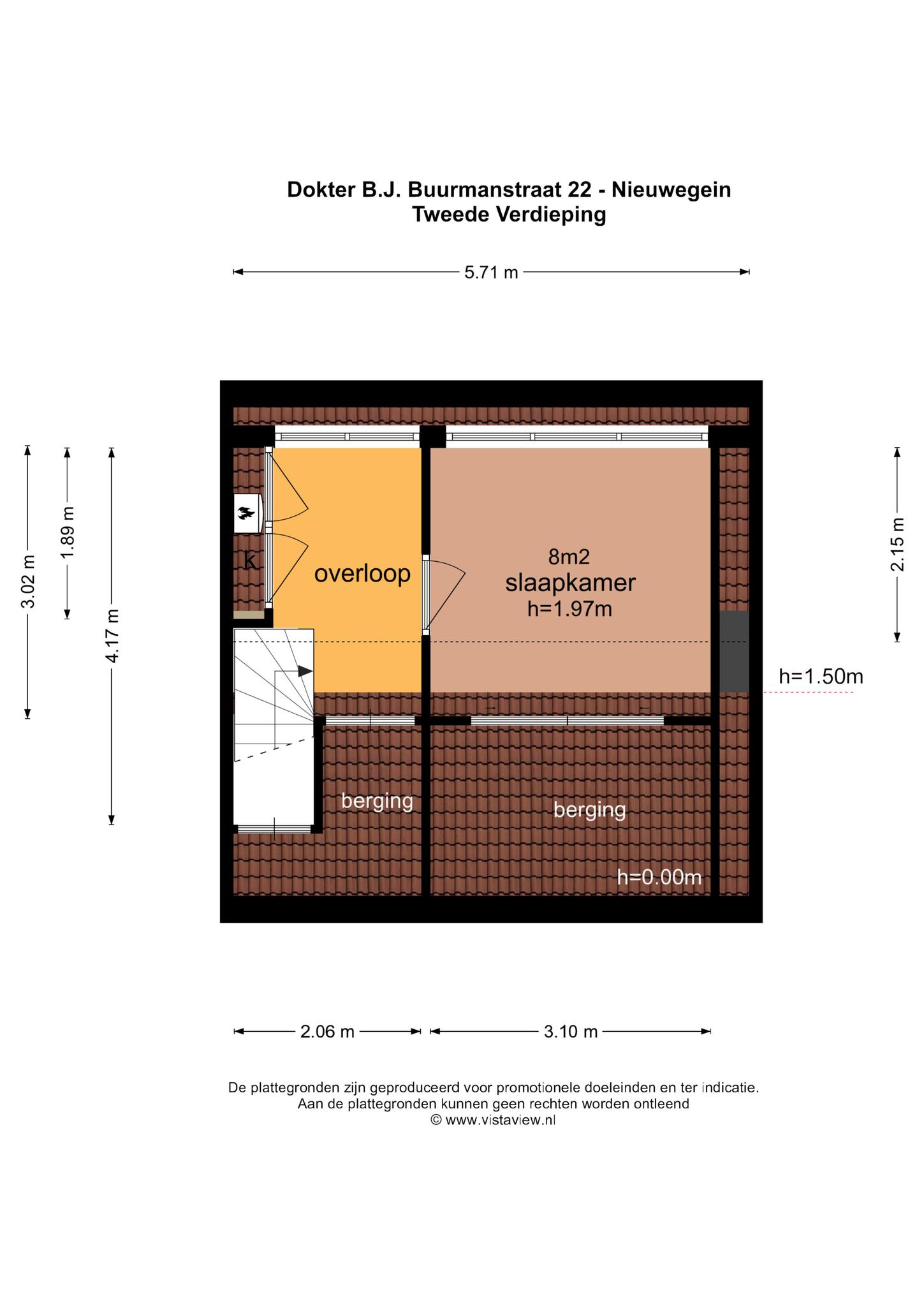 – De tweede verdieping heeft een oppervlakte van circa 12 m², door de hoogte van 1.97 meter mag deze verdieping niet meegenomen worden in de woonoppervlakte;