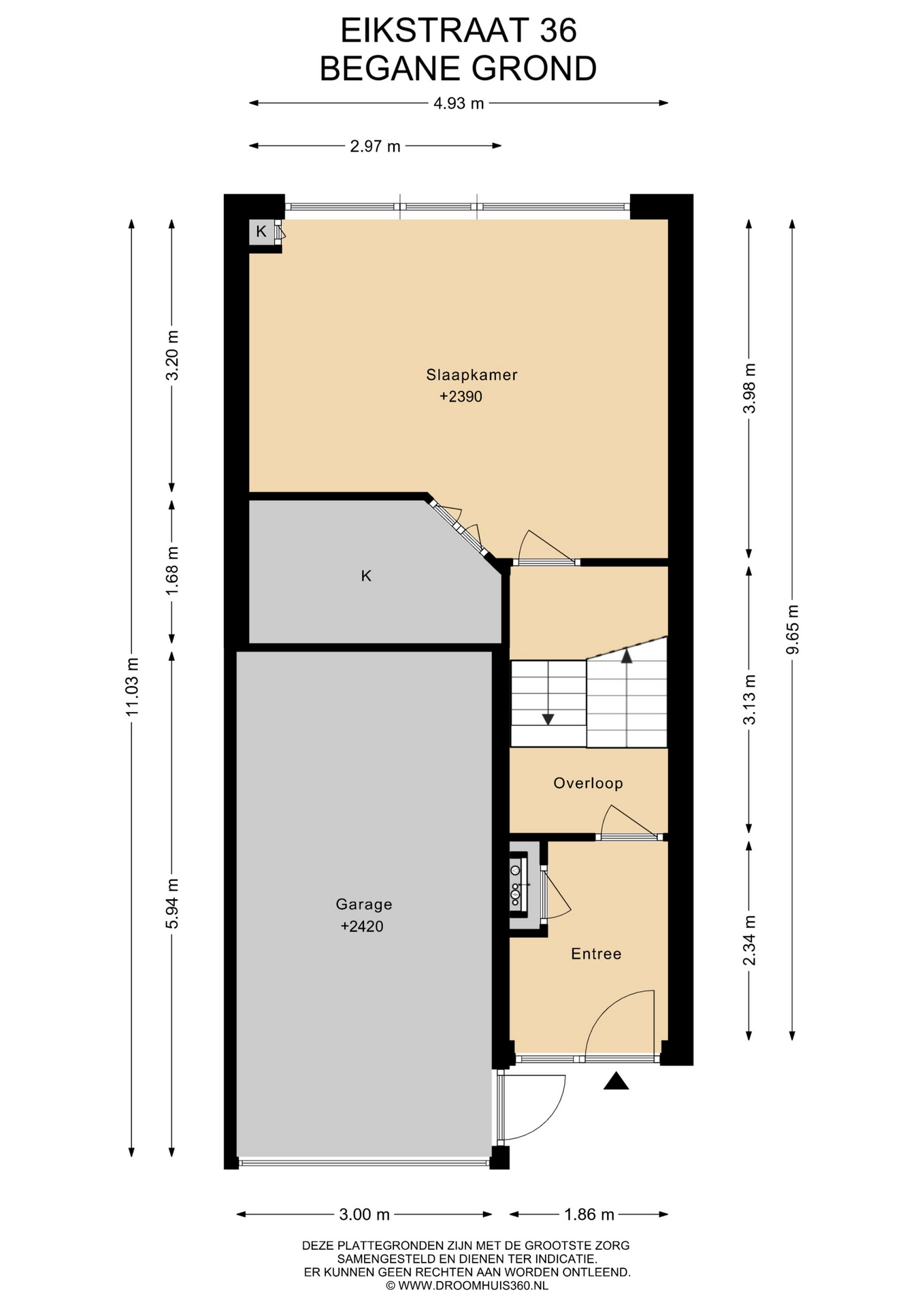 Entree via de eigen oprit. Je komt binnen in een ruime hal met meterkast. Aan de voorzijde bevindt zich de garage welke is voorzien van elektra.