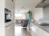 Entree hal, met een toilet, meterkast en de trap naar boven. Via de hal komt u de woonkamer binnen, welke ruim en licht is. De woonkamer telt ongeveer 28m². Aan de voorzijde van het appartement, treft u de keuken aan. Hoogglans wit met een prachtig natuursteen blad voorzien van allen Siemens apparatuur; keramische kookplaat, afzuigkap, combi magnetron/oven, een koel/vriescombinatie en een vaatwasser.