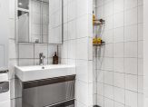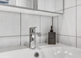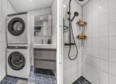 De badkamer met inloopdouche, wastafel met spiegel en meubel, ruimte en aansluitingen voor de wasmachine en een droger.