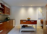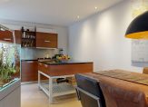De begane grond bestaat uit een ruime woonkamer die veel natuurlijk licht biedt. De keuken is voorzien van alle moderne gemakken en heeft de beschikking over diverse inbouwapparatuur. Op de begane grond liggen extra grote design tegels met vloerverwarming.