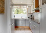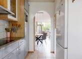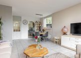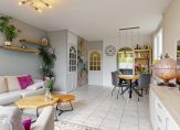 Entree via een ruime hal met vernieuwde meterkast, praktische kastruimte en een modern afgewerkt toilet met fonteintje. De lichte en royale woonkamer is gesitueerd aan de achterzijde van de woning en beschikt over een extra zijraam, wat zorgt voor aangenaam daglicht. Aan de voorzijde bevindt zich de open keuken, uitgevoerd met een natuurstenen aanrechtblad. De gehele begane grond is voorzien van een plavuizen vloer.