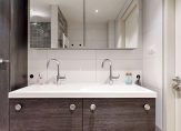 Overloop met toegang tot de 2-tal ruime slaapkamers (voorheen 3 slaapkamers) en moderne badkamer. De slaapkamers zijn ruim bemeten en praktisch te gebruiken. Moderne badkamer welke geheel is betegeld en voorzien van dubbele vaste wastafel met meubel, toilet en inloopdouche met hemeldouche en glazen deur. De verdiepingsvloeren zijn voorzien van laminaat.