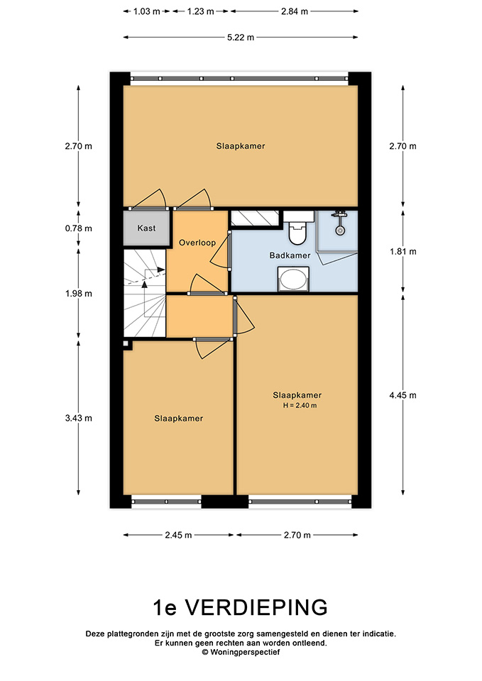 Vanuit de trap in de woonkamer bereikt u de overloop op de 1e verdieping met toegang tot twee slaapkamers (ca. 12 m², ca. 8 m²) aan de voorzijde en een royale derde slaapkamer