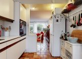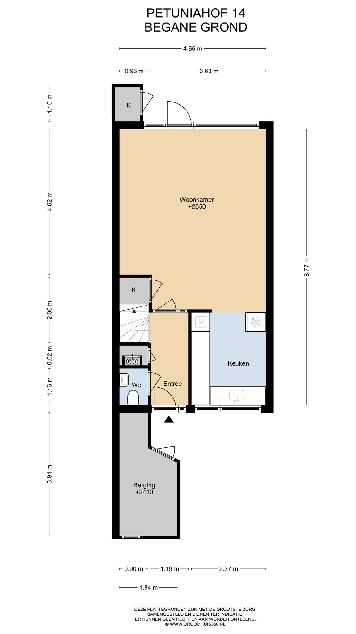Begane grond: entree/hal met meterkast en toilet. De woonkamer is tuingericht en geeft via een deur toegang tot de achtergelegen tuin. De halfopen keuken bevindt zich aan de voorzijde en is voorzien van een eenvoudige keukeninrichting in hoekopstelling met 4-pits gas, afzuigkap, vaatwasser en oven.