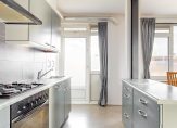 Indeling woning: Hal, toilet, garderobe en meterkast met nieuwe groepen, inbouwkast met w.m.-aansluiting, de doorzonkamer is ruim en heeft mede door de grote raampartijen een goede lichtinval. Ook het extra zijraam draagt hier aan bij. Een balkon is vanuit de woonkamer bereikbaar en gelegen op het Westen. Het tweede balkon is bereikbaar vanuit de keuken. De keuken is half open gemaakt en voorzien van een keukeninrichting met inbouwapparatuur als gaskookplaat, oven, afzuigkap, koelkast, vriezer en vaatwasser. De badkamer is modern uitgevoerd en heeft een wastafel alsmede inloopdouche.