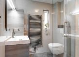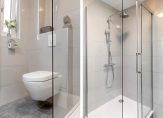 Slaapverdieping: Een overloop leidt naar drie ruime slaapkamers en een moderne badkamer met douchecabine, tweede toilet en een stijlvol wastafelmeubel.