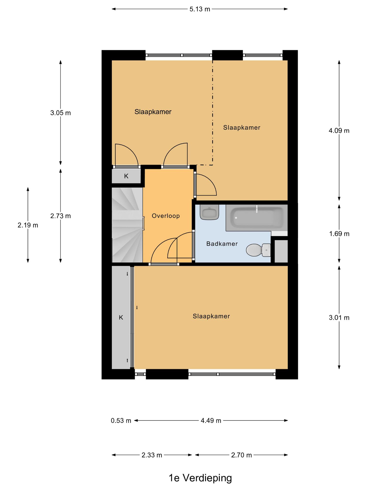 Je komt boven op de overloop en daarvandaan kun je 2 ruime slaapkamers en de badkamer bereiken. De badkamer is voorzien van een wastafel, 2e toilet en ligbad.