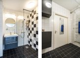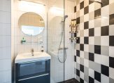 De badkamer is geheel betegeld en beschikt over een inloopdouche, een wastafel met meubel en een design radiator, ideaal voor de handdoeken. Een groot pluspunt, vooral wanneer u gasten ontvangt, is dat er een separate toiletruimte is. Deze ruimte is v.v. zwevend closet en fonteintje.